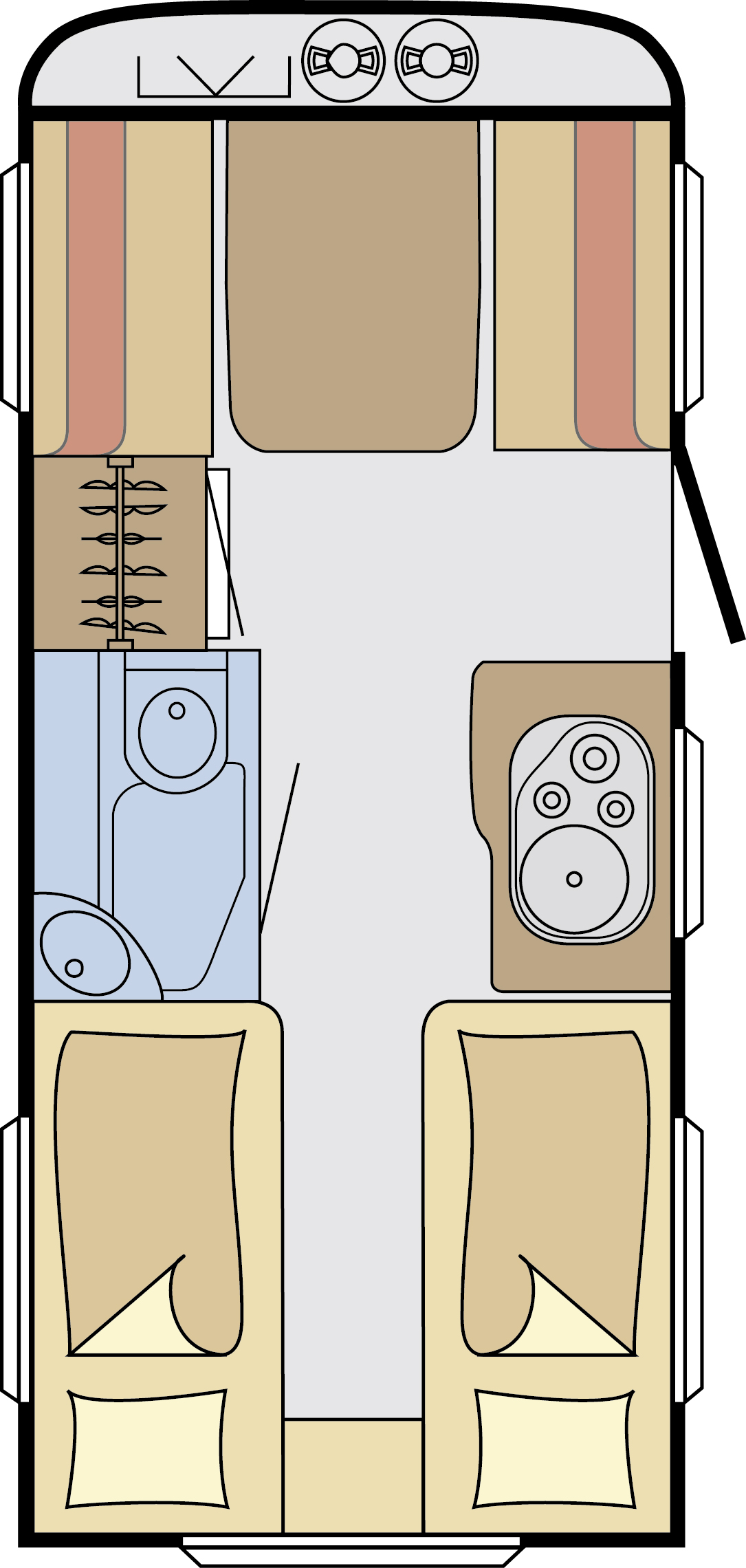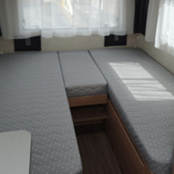 Der Vorteil eines Wohnwagens besteht darin, dass man sein „Quartier“ auf dem Campingplatz zurücklassen kann, um die Gegend zu erkunden. Ein Caravan hat ähnlichen Komfort wie ein Wohnmobil. 2-4 Personen reisen und wohnen sehr bequem. Die Einzelbetten im Heck verwandeln sich in 10 Sekunden zu einem großen Doppelbett. Vorn kann man die Sitzgruppe zu einer weiteren Schlafgelegenheit umgestalten. Sonnensegel und mobile Sat-Anlage sind optional zubuchbar.